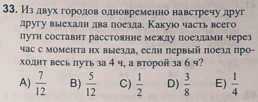 1/4+1/6= 2/12+3/12=5/12 пути прошли вместе за час. Единица- весь путь, то 1-5/12=12/12 -5/12=7/12- часть пути, которая осталась между поездами