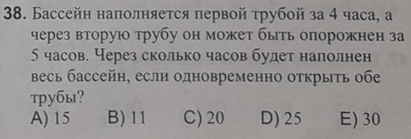 Бассейн наполняется первой трубой за 4 часа, а через вторую трубу он может быть опорожнен за 5 часов. Через сколько часов будет наполнен весь бассейн, если одновременно открыть обе трубы?