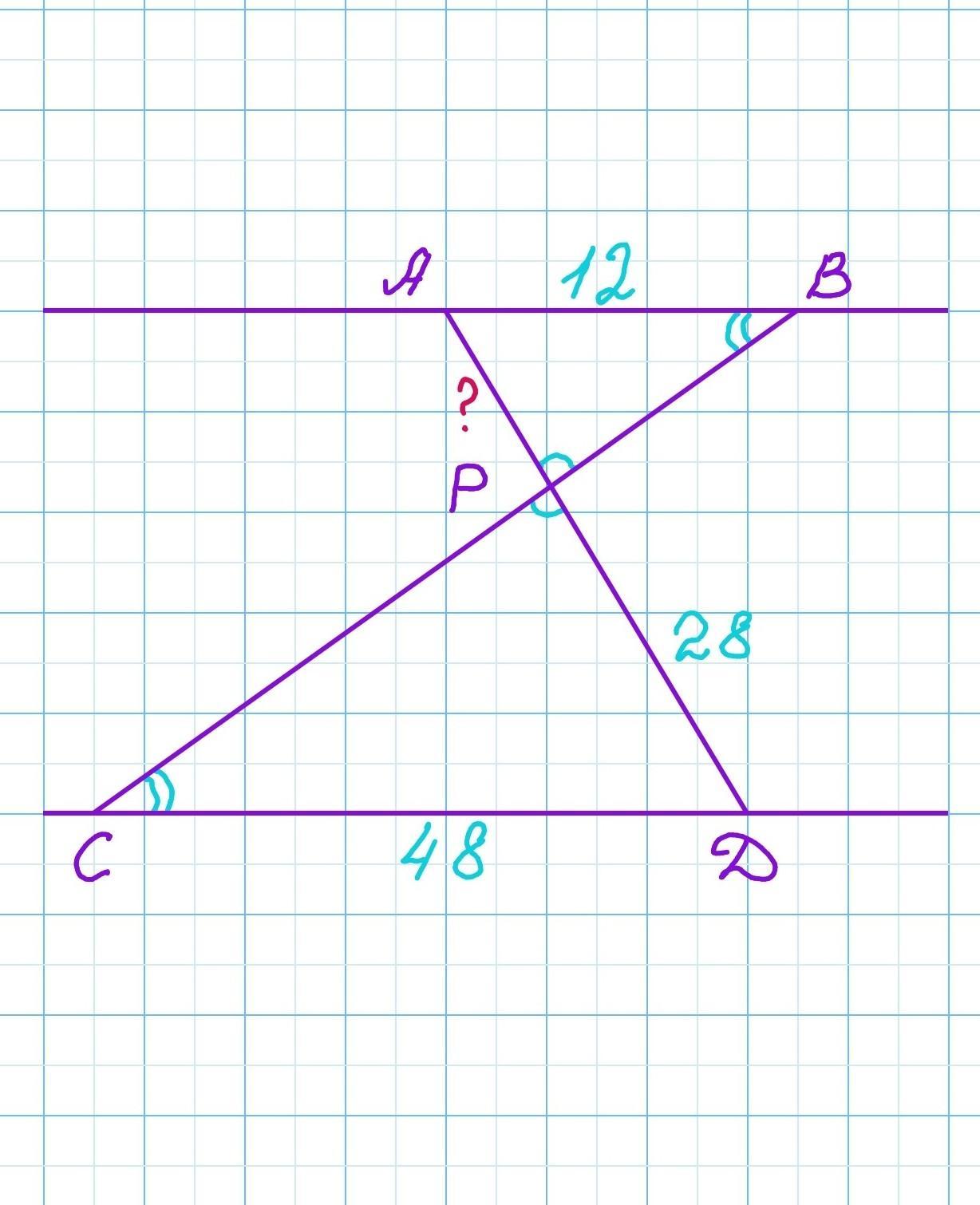 Отрезки AB и CD лежат на параллельных прямых, а отрезки AD и BC пересекаются в точке P. Известно, что PD=28, AB=12, DC=48.