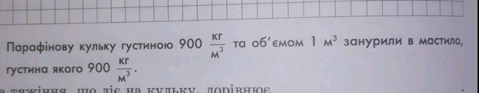 15.2. Парафінову кульку густиною 900 та об'ємом 1 м3 занурили в мастило, MY КГ густина якого 900 M