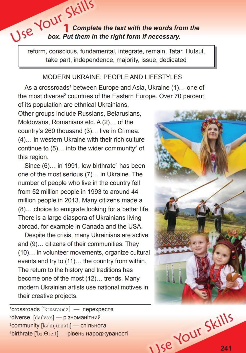 1. remains 2. majority 3. Tatars 4. Hutsuls 5. independence 6.reform 7. issues 8. conscious 9. dedicated 10. take part 11. integrate 12. fundamental