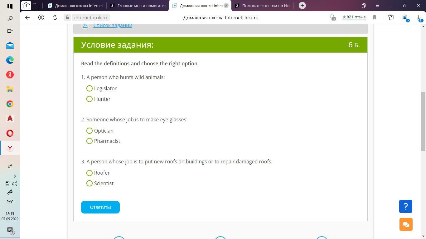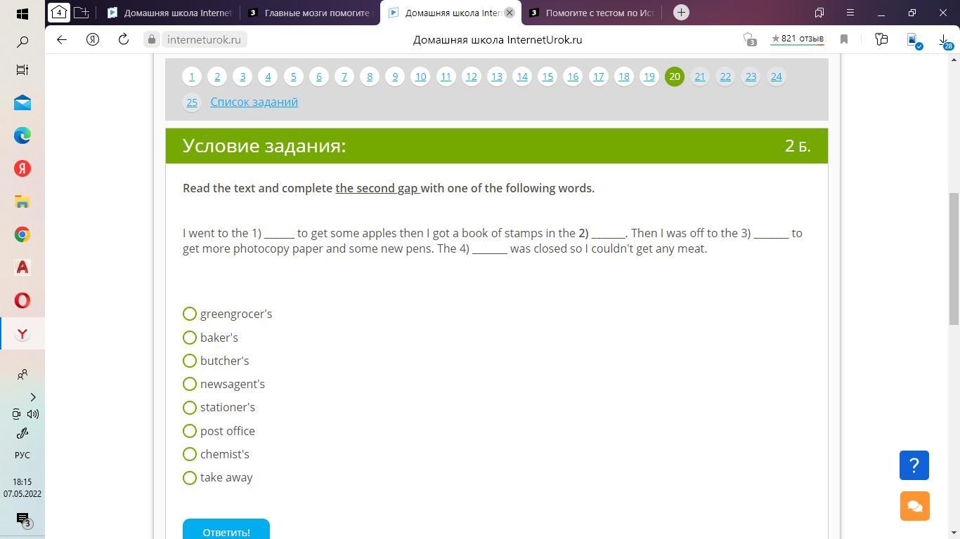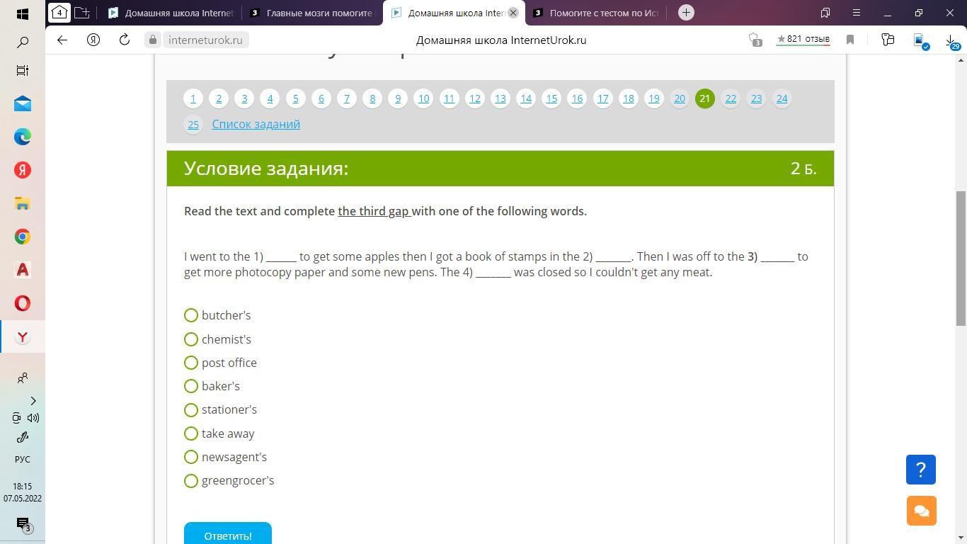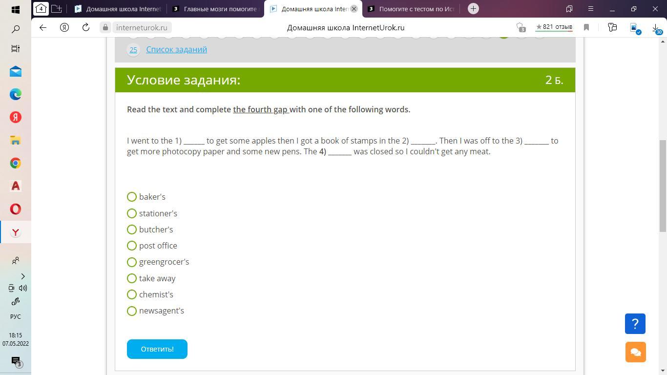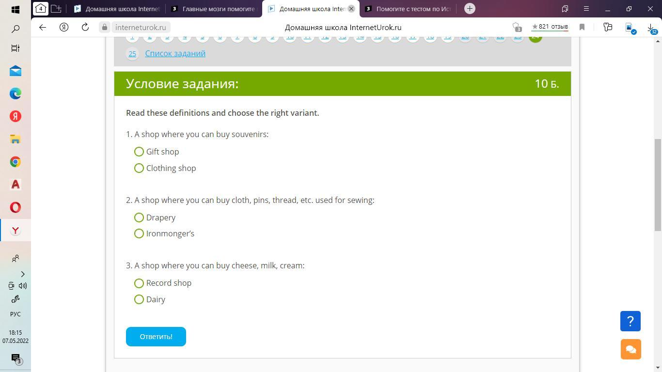 1. 1) Gift shop, 2) Drapery, 3) Dairy; 2. 1) Hunter, 2) Optician, 3) Roofer; 3. butcher's; 4. stationer's; 5. post office.