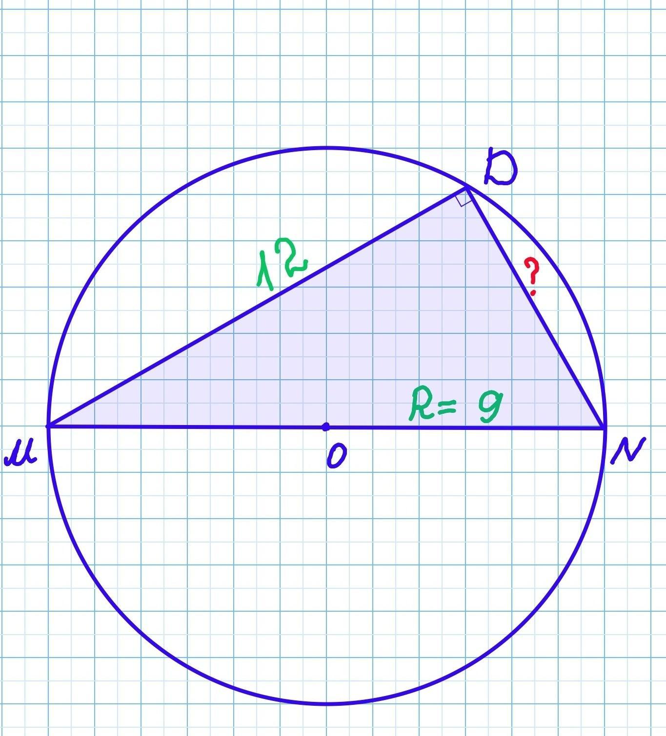 В окружности проведены диаметр MN и хорда MD. МD = 12, а радиус окружности равен 9 см. Найди длину хорды DN