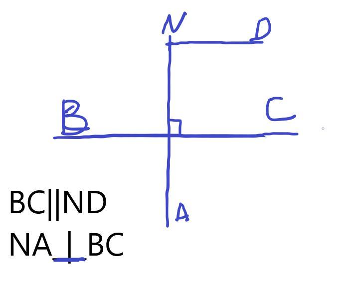 Побудуйте пряму BC Вибери точку N поза прямою. За допомогою Косинця і лінійки побудуйте пряму NA Перпендикулярно до прямої BC Та пряму ND Паралельно премій BC