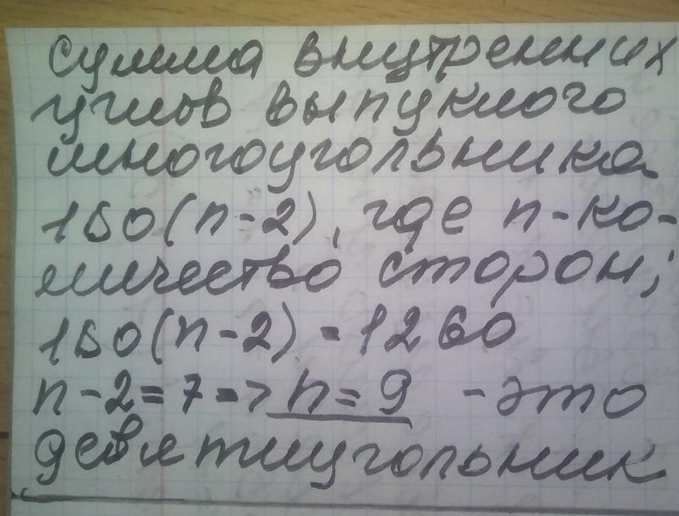 Сколько сторон имеет ВЫПУКЛЫЙ МНОГОУГОЛЬНИК, если сумма всех его ВНУТРЕННИХ УГЛОВ равна 1260° ?