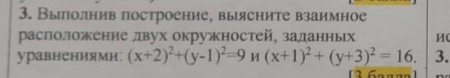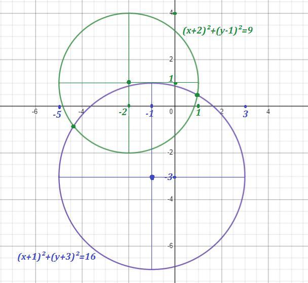 первая окружность с центром в точке (2;-1) и радиусом 3. Вторая окружность с центром в точке(1;-3) и радиусом 4