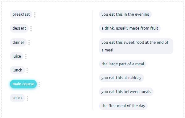 Dessert (десерт) - You eat this sweet food at the end of a meal