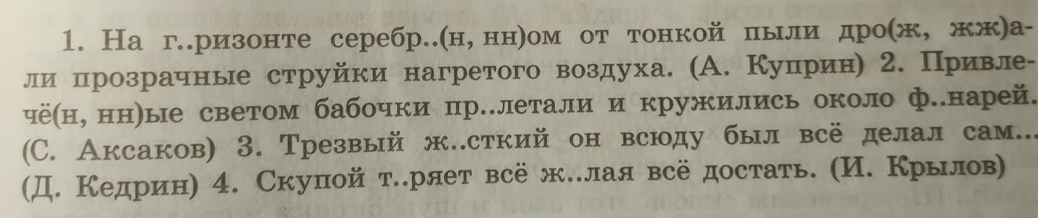 1. На горизонте серебряном от тонкой пыли дрожали прозрачные струйки нагретого воздуха. (А. Куприн) 2. Привлечëнные светом бабочки пролетали и кружились около фонарей. (С. Аксаков) 3. Трезвый жëсткий он всюду был всë делал сам... (Д. Кедрин) 4. Скупой теряет всё желая всё достать. (И. Крылов)