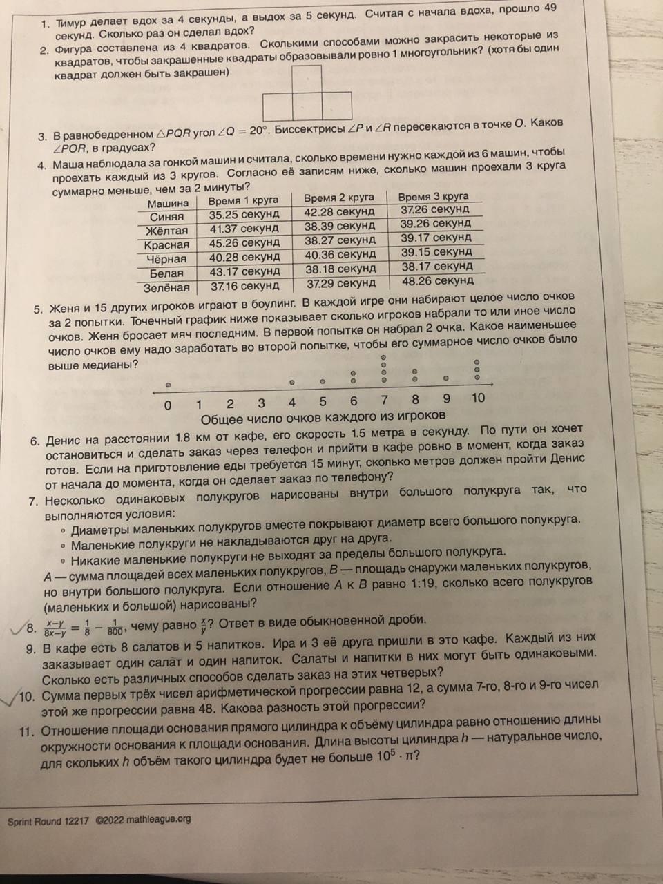 По графику понимаем, что 0 очков получил 1 человек, 4 очка - 1 человек, 5 очков - 1 человек, 6 очков - 2 человека, 7 очков - 4 человека, 8 очков - 2 человека, 9 очков - 1 человек, 10 очков - 3 человека.