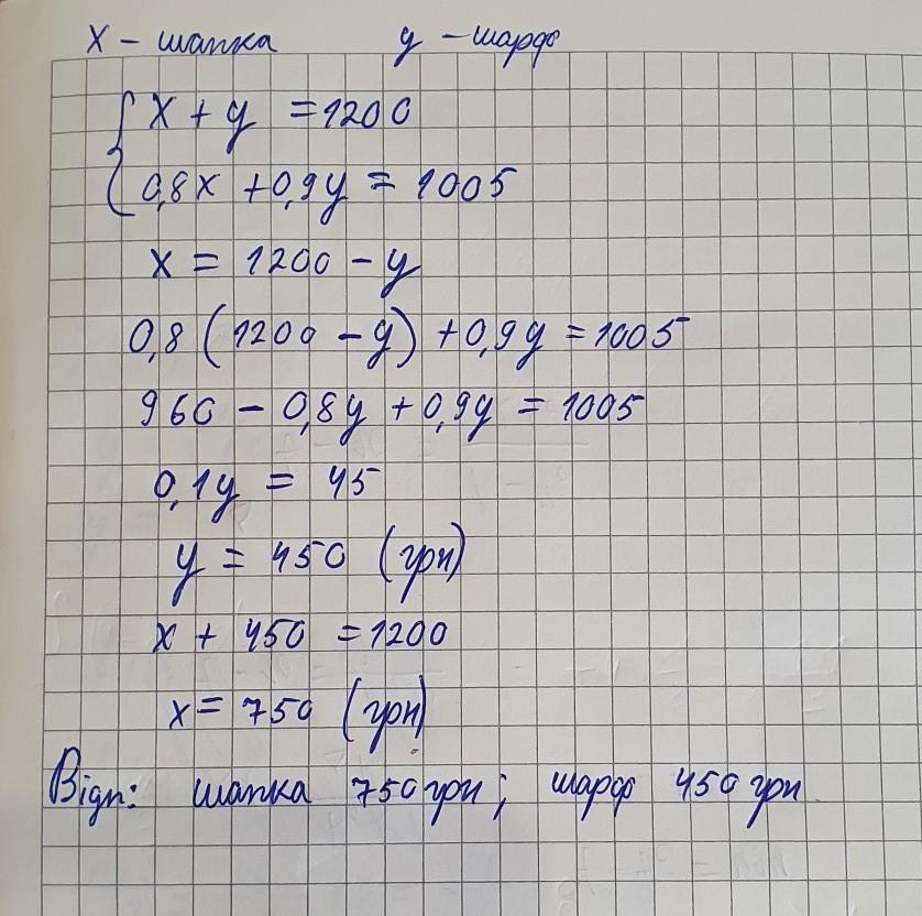а) Шапка та шарф разом коштували 1 200 грн. Після того як шапка