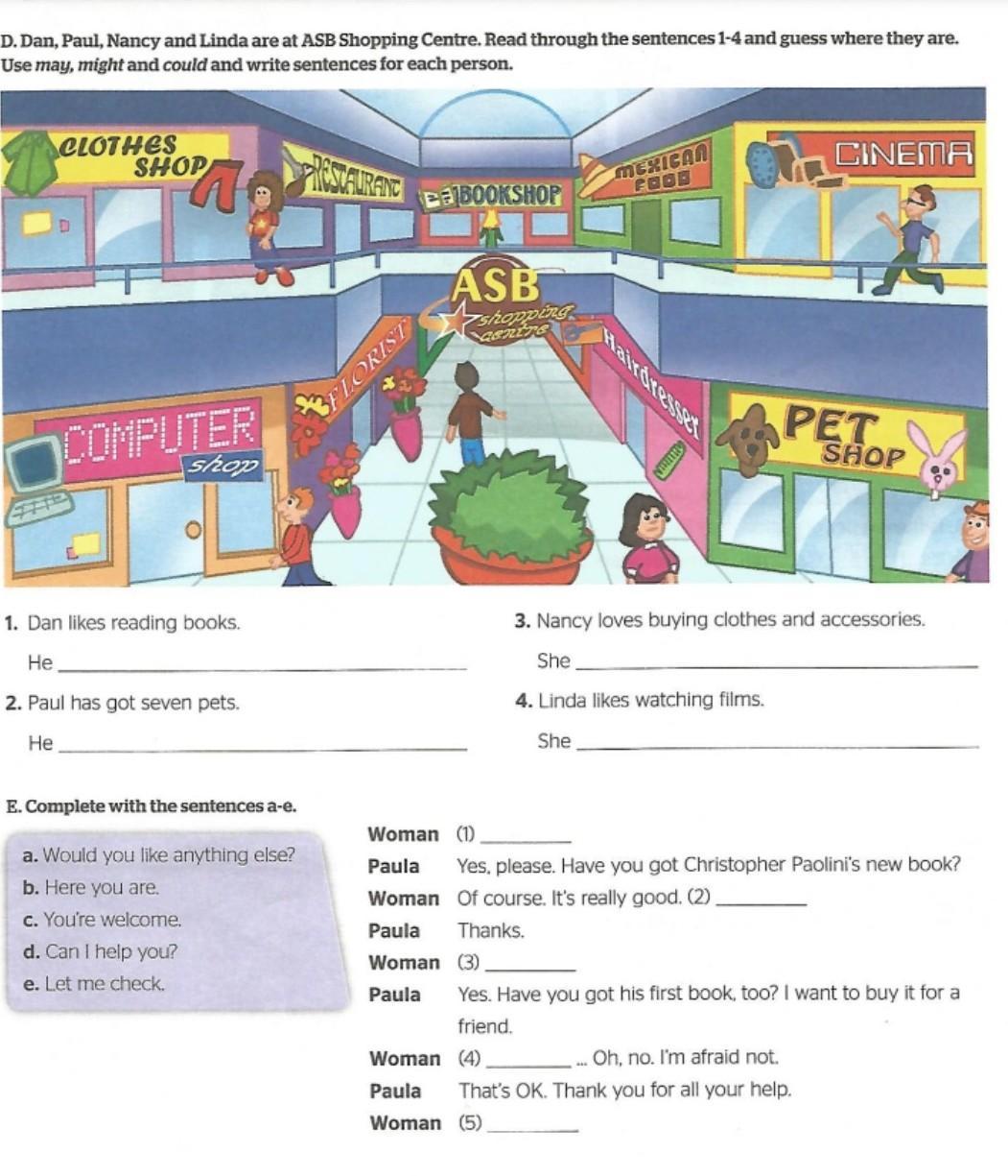 Ответ D He may go to the book shop. 2. He might go to the pet shop. 3. She could go to the clothes shop. 4. She might go tothe cinema.