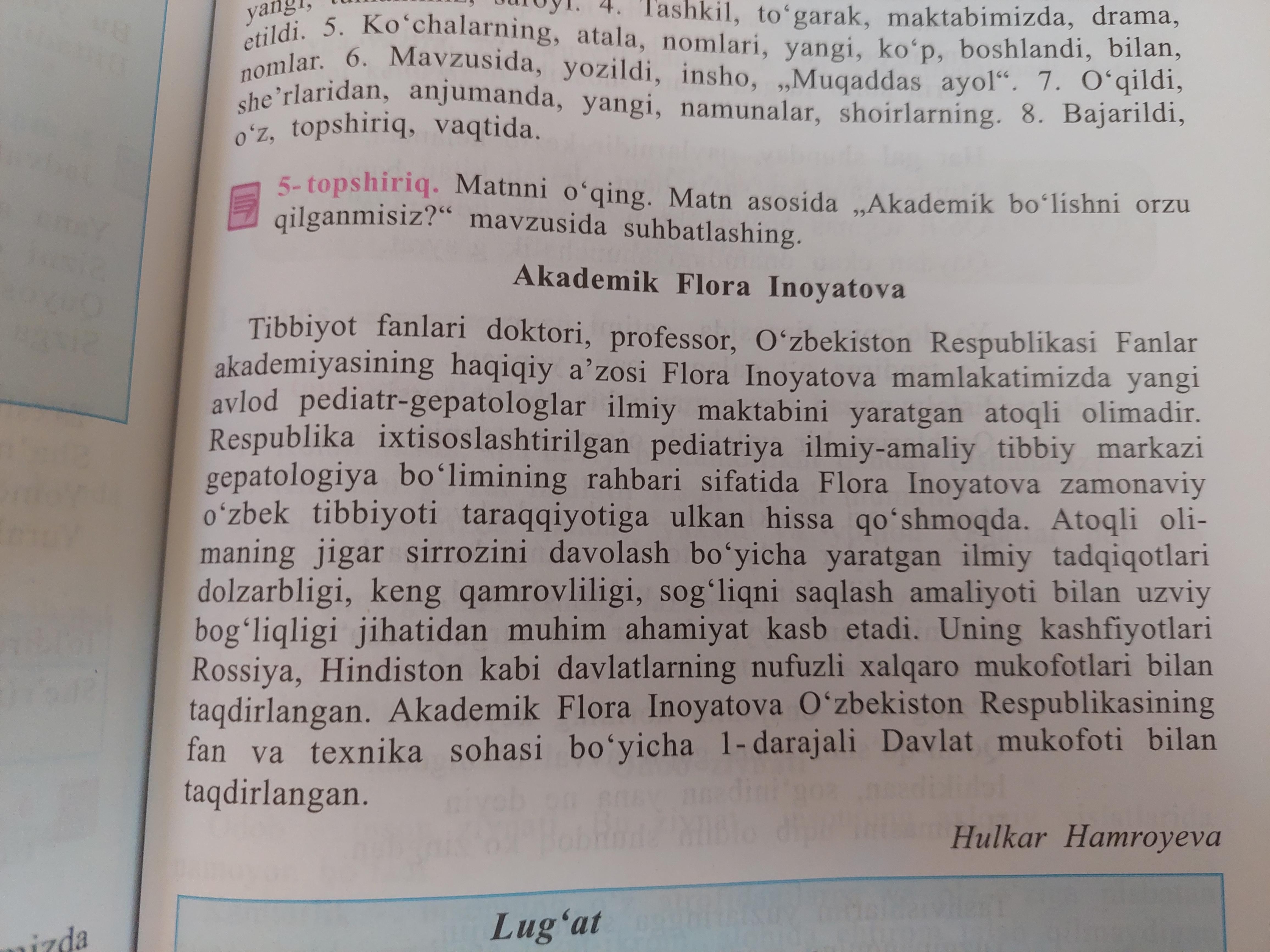 Matnning mazmuni shundagi dunyoga yaxshilik ulashish . Flora Inoyatovna ham maktab yaratgan va tibbiyotga katta xissa qoshgan . Bu odamlar uchun juda katta yordam . Yana u jigar sirrozinini davolash uchun darmin dori topib koplab odamlarning hayotini qutqargan . U shu mehnati ketidan sharaf qozonib O'zbekiston fan va texnika sohasi bo'yicha 1-Davlat mukofoti bilan taqdirlangan. U faqat bir ishda toxtamay o'zini ko'plab ishlarda sinab ko'rgan . Mehnat qilgan va bu qolidan kelgan .