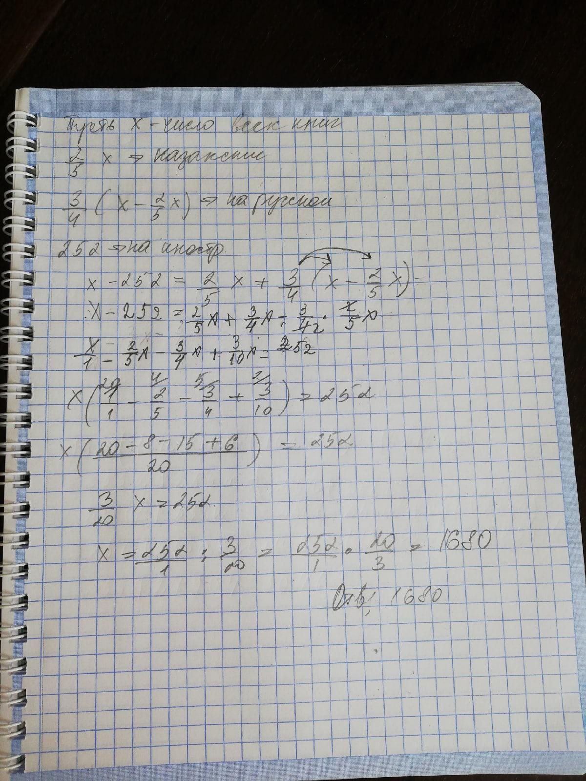 В библиотеке 2/5 всех книг составляют книги на казахском языке. Книги на русском языке составляют 3/4 остатка, а остальные 252 книги на иностранном языке. Сколько всего книг в библиотеке?