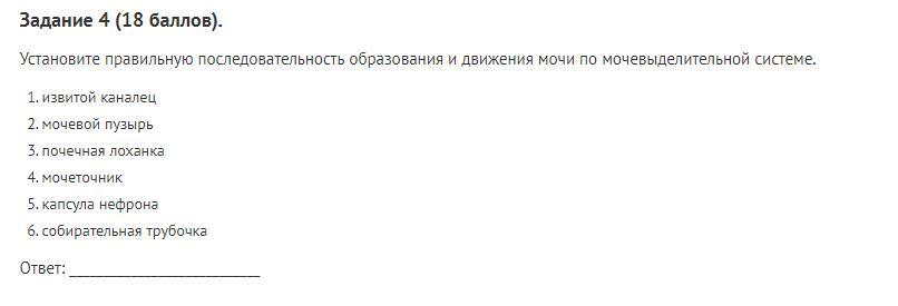 Сначала в капсуле в капсуле нефрона(5) происходит фильтрация крови. По собирательной трубочке(6) вторичная моча стекает в почечную лоханку(3). Из неё по мочеточнику(4) моча попадает в мочевой пузырь(2),а после в извитой каналец(1),откуда выделяется.