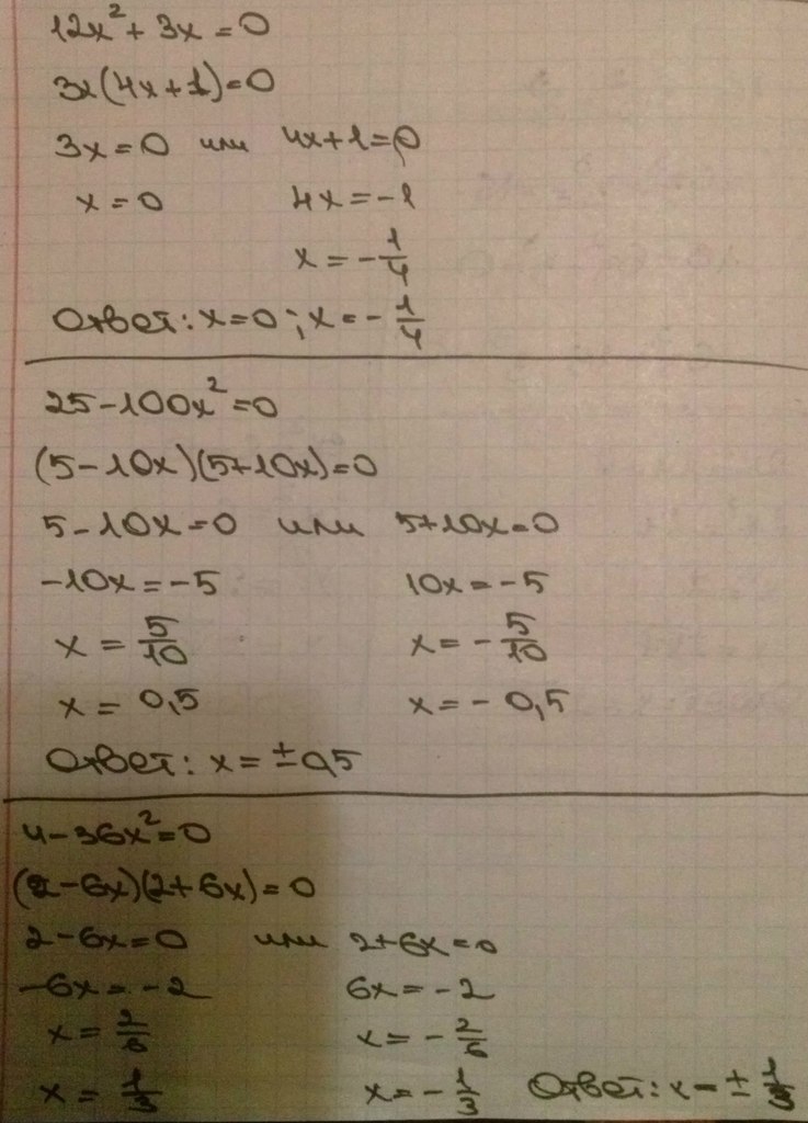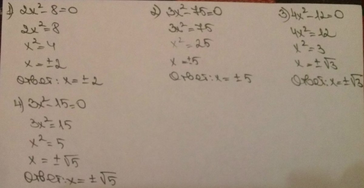 А вот и я :в 1) 2х²-8=0 2) 3х²-75=0 3) 4х²-12=0 4) 3х²-15 =0; :3