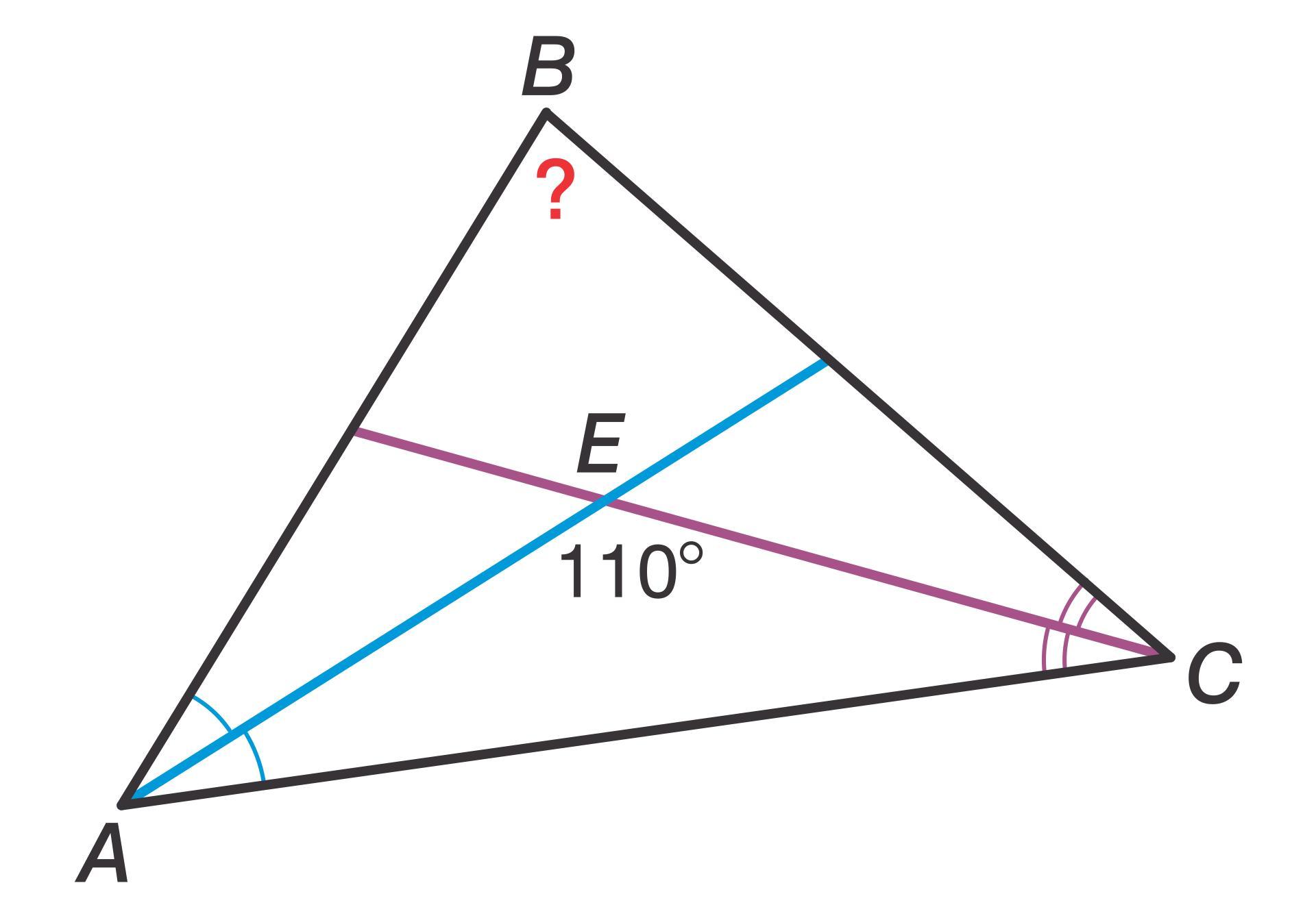 Две бессектрисы треугольника пересекаются в точке E. ∠AEC = 110∘. Найдите величину угла, отмеченного знаком вопроса.