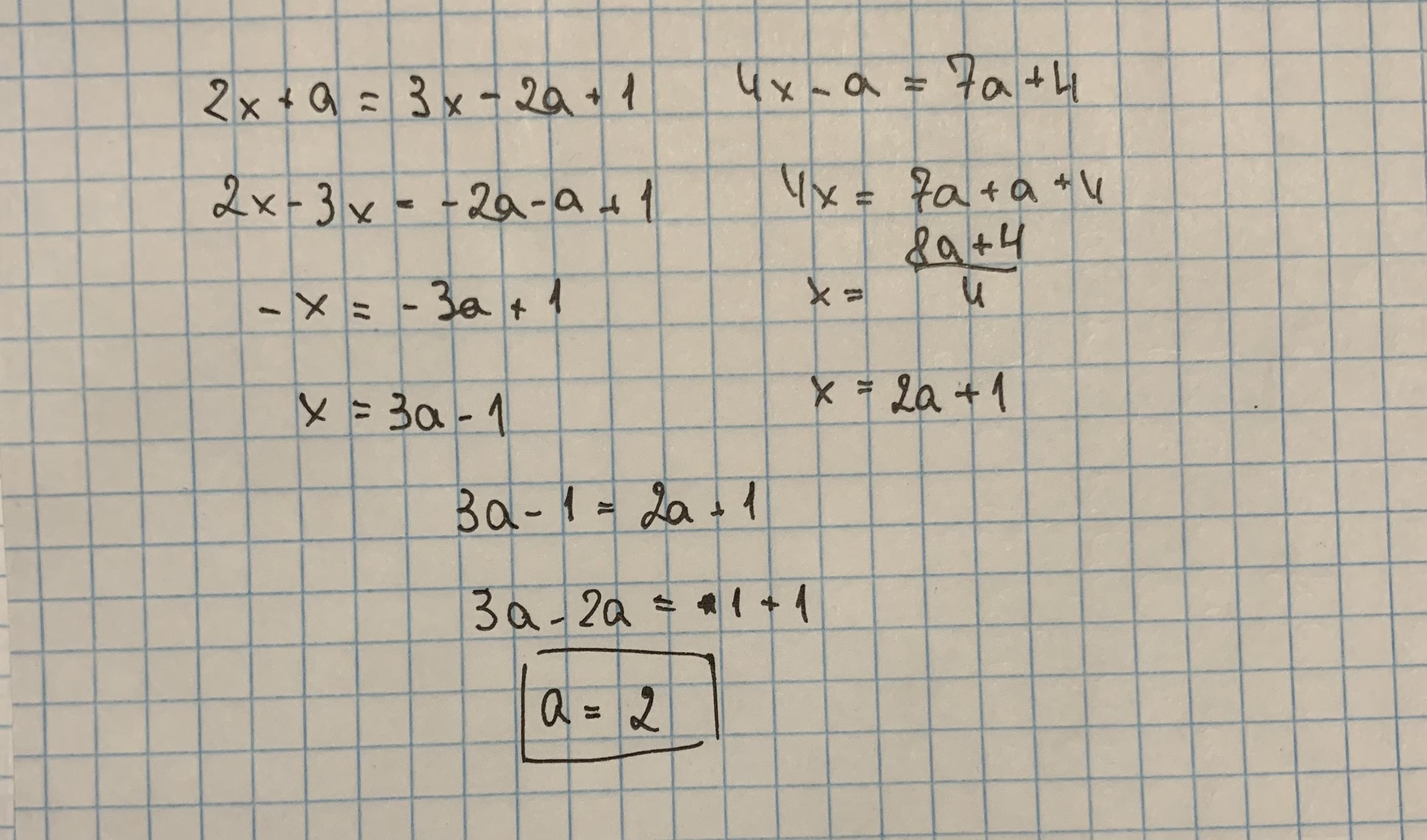 Знайти значення параметра а, за якого рівняння 2x+a=3x-2a+1 і 4x-a=7a+4