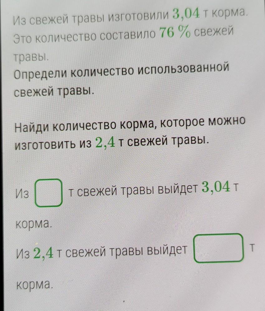 Из свежей травы изготовили 3,04 т корма Это количество составило 76 % свежей травы. Определи количество использованной свежей травы. Найди количество корма, которое можно изготовить из 2,4т свежей травы. ЕН Из _ т свежей травы выйдет 3,04 т корма. Из 2,4т свежей травы выйдет T Корма? Помогите срочно