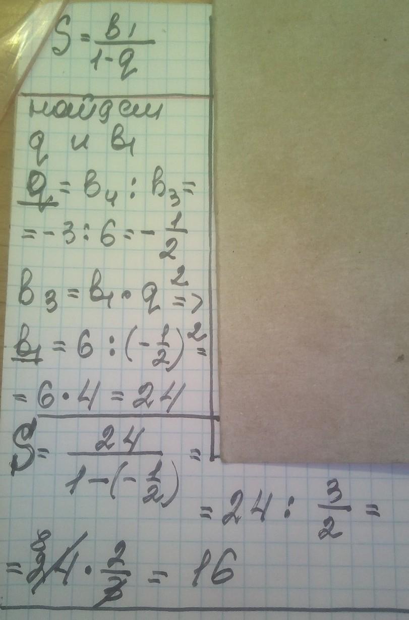 Знайти суму нескінченної геометричної прогресії, якщо третій її член дорівнює 6, а четвертий член дорівнює -3.