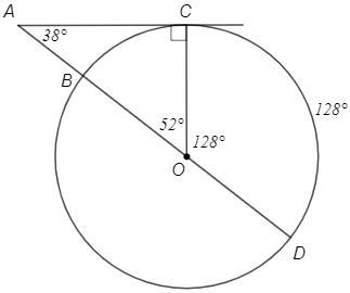 2. Из точки А к окружности с центром О проведены касательная АС и секущая АО, пересекающая окружность в точках В и D, считая от точки А. Найдите угол CAD, если дуга CD равна 128°.