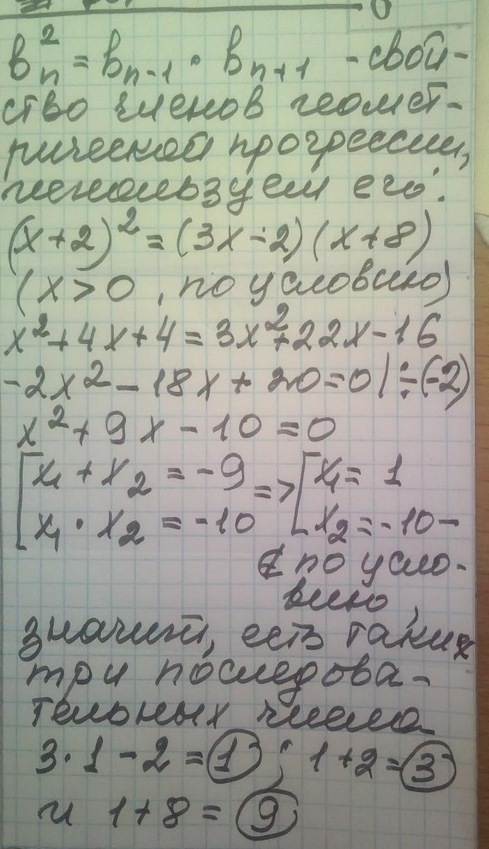 При якому додатньому значенні х числа 3х-2, х+2, х+8 будуть послідовними членами геометричної прогресії?