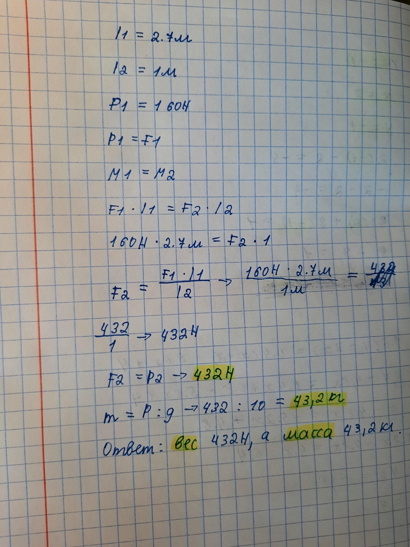 Лёша сидит на расстоянии 2,7 метров от точки опоры качелей A, а Петя — на расстоянии 1 м. Сколько весит Петя, если Лёша весит 160 Н, а качели находятся в равновесии?