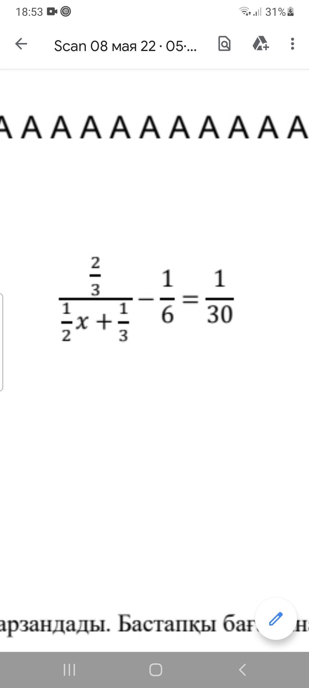 \frac{\frac{2}{3} }{\frac{1}{2} x+\frac{1}{3} } -\frac{1}{6} =\frac{1}{30} \\\\\frac{\frac{2}{3} }{\frac{1}{2} x+\frac{1}{3} }=\frac{1}{30} +\frac{1}{6} \\\\\frac{\frac{2}{3} }{\frac{1}{2} x+\frac{1}{3} }=\frac{1}{30} +\frac{5}{30} \\\\\frac{\frac{2}{3} }{\frac{1}{2} x+\frac{1}{3} }=\frac{1}{5} \\\\5*\frac{2}{3} =\frac{1}{2} x+\frac{1}{3} \\\\\frac{10}{3} =\frac{1}{2} x+\frac{1}{3} \\\\\frac{1}{2} x=\frac{10}{3} -\frac{1}{3} \\\\\frac{1}{2} x=3\\\\x=6