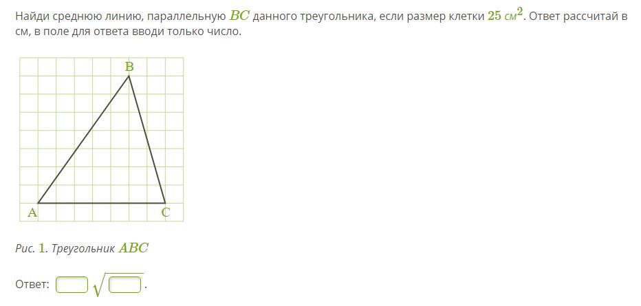 Найди cреднюю линию, параллельную BC данного треугольника, если размер клетки 25 см2. Ответ рассчитай в см, в поле для ответа вводи только число.