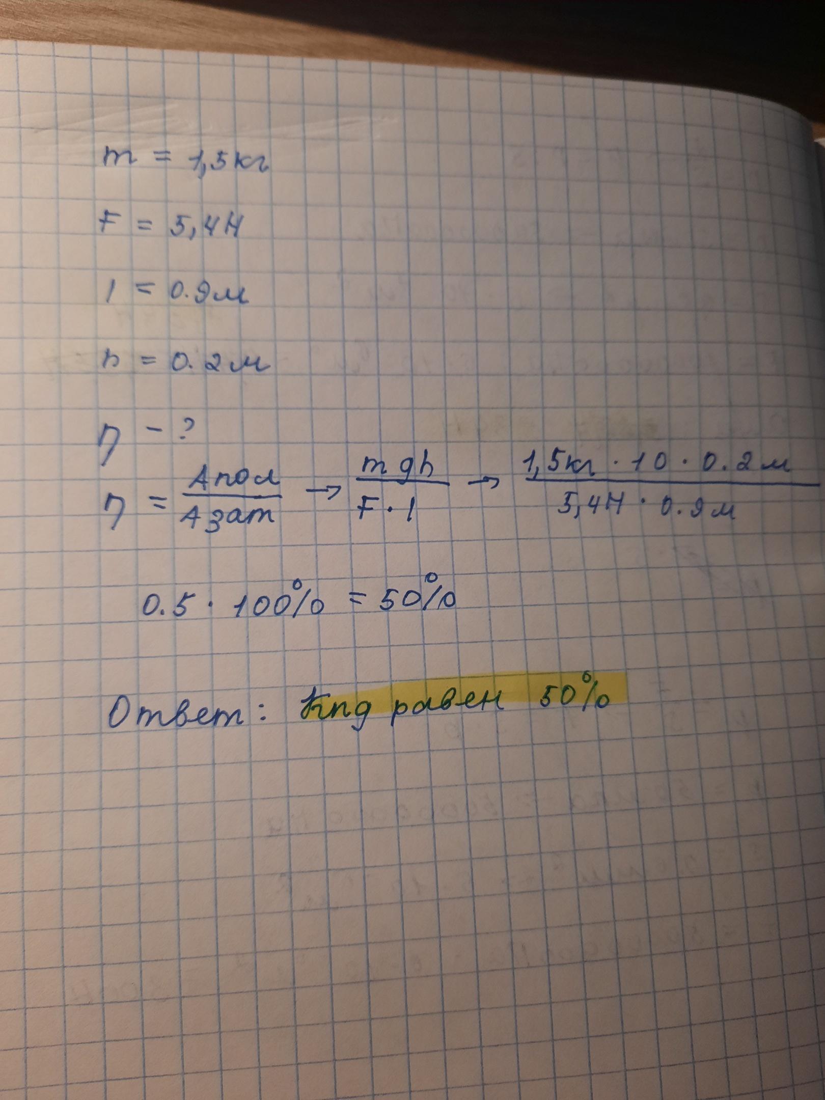 Школьник, перемещая равномерно по наклонной доске груз массой 1,5 кг, приложил силу 5,4 H. Каково значение КПД конструкции, если длина доски 0,9м и высота над горизонтальным уровнем 0,2м? срочно