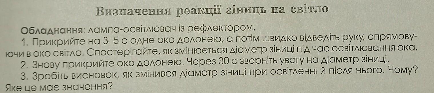 1. Прикройте на 3-5 с один глаз ладонью, а затем быстро отведите руку, направляя в глаз свет. Наблюдайте, как меняется диаметр зрачка при освещении глаза.