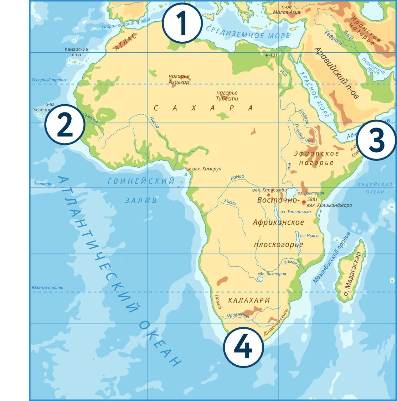 Установите соответствие между крайней точкой Африки и цифрой, которой она обозначена на карте.