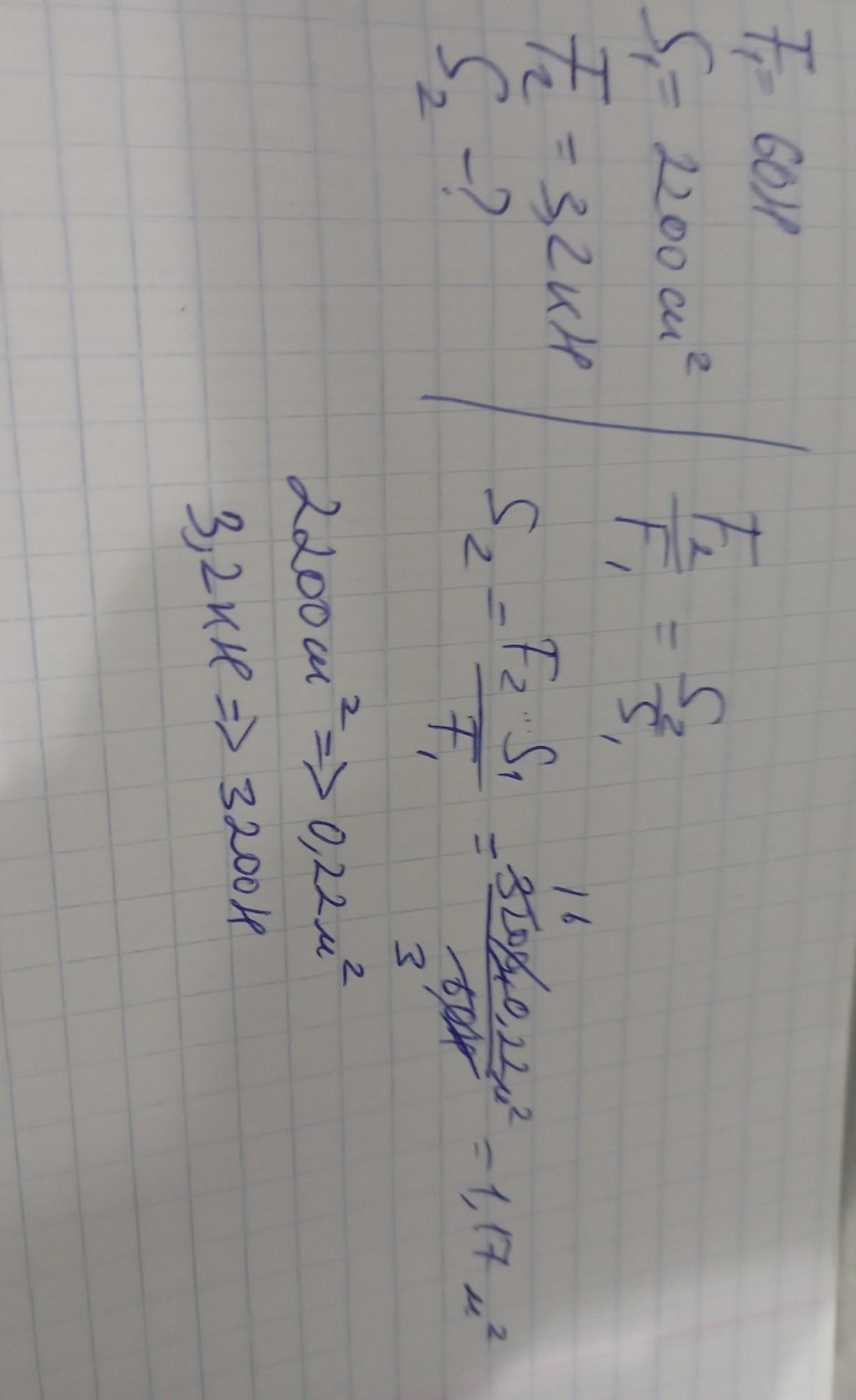 Якщо на менший поршень гідравлічного преса діє сила 60 Н, то на більший поршень площею 2200 см2 передається сила тиску3,2 кН. Яка площа меншого поршня?