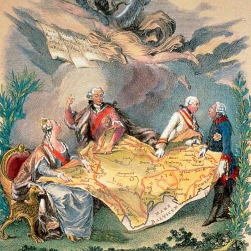 Катерина 2 держе зліва карту, нібито ділить її. Справа неї нібито Суворов. Два чоловіка справа це голови тодішньої Речі Посполитої