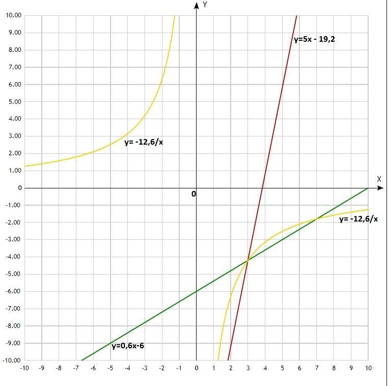 Уравнение обратной пропорциональности: у = -12,6/х.