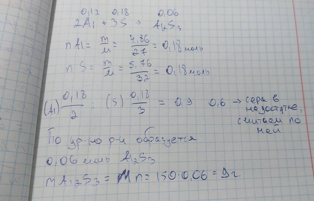 Вычислите количество вещества сульфида алюминия, который образуется при взаимодействии 4,86 г алюминия с 5,76 г серы.