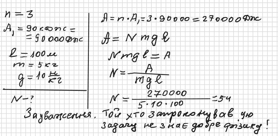 Самий крутий пацан на районі, або просто Козел, весь аж упрів тягнучи капусту з городу баби Палашки. Скільки голівок капусти не дорахувалась бабця, якщо козел виконав 3 «ходки» кожного разу виконуючи роботу 90кДж переносячи скарб у свій погріб викопаний за 100м від городу бабці та брав лише голівки масою 5кг