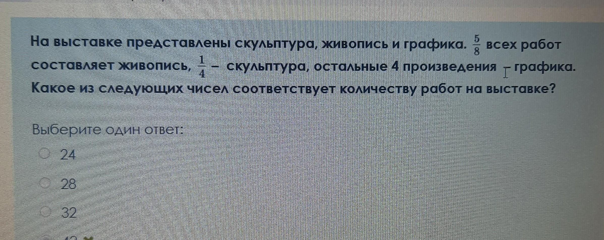 на выставке представлены скульптура живопись и графика 5/8 всех работ составляет живопись 1/4 скульптура остальные четыре произведения График какой из следующих чисел соответствует количеству работ на выставке
