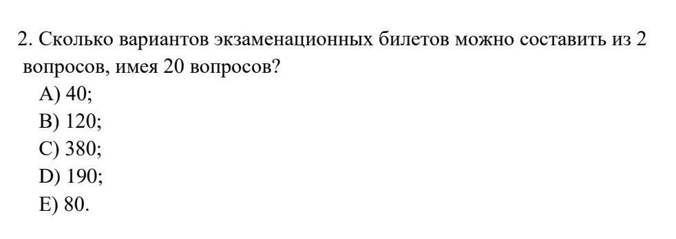 20 вариантов выбора первого вопроса, тогда второй вопрос можно выбрать уже из 19 оставшихся. Получаем: