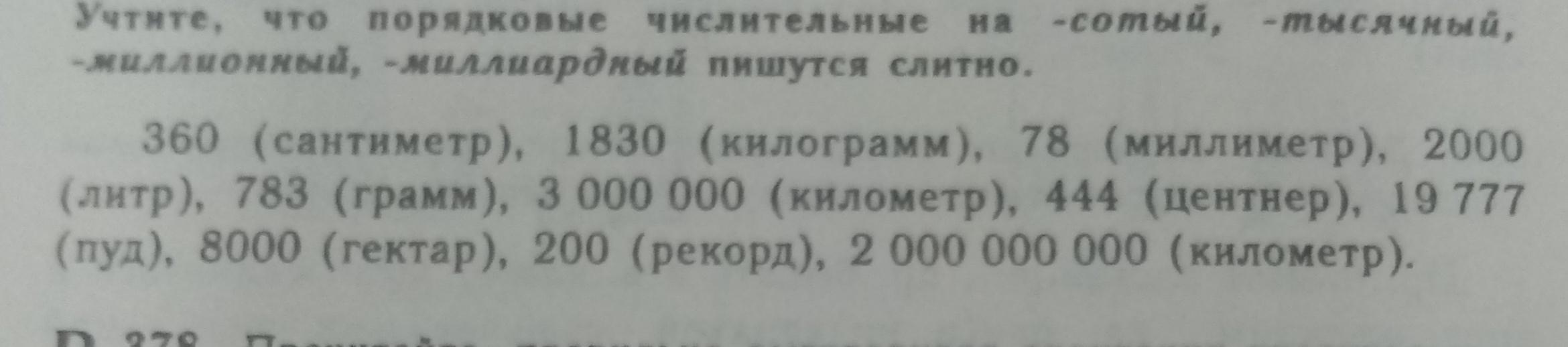 Триста шестьдесят сантиметров, одна тысяча восемьсот тридцать килограмм, семьдесят восемь миллиметров, две тысячи литров, семьсот восемьдесят три грамма, три миллиона километра, четыреста сорок четыре центнера, девятнадцать тысяч семьсот семьдесят семь пудов, восемь тысяч гектара, двести рекордов, два миллиарда километров.
