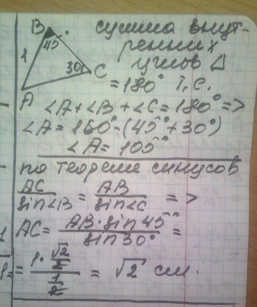 прошу сделайте!!! у трикутника abc AB=1 см кут C=30⁰ кут B=45⁰.Знайдіть AC i кут А​