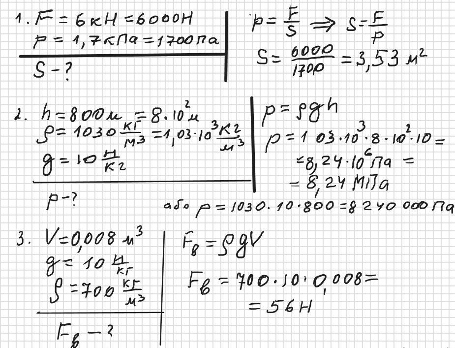 Якою має бути площа, щоб силою в б кН чинити тиск в 1,7 кПа?