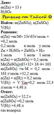 Добудьте цинк сульфат, маючи цинк і сульфатну кислоту. Обчисліть масу та кількісь речовини утвореної солі, якщо в реакію вступив цинк масою 1,3 г. Який газ виділиться і який його об'єм?