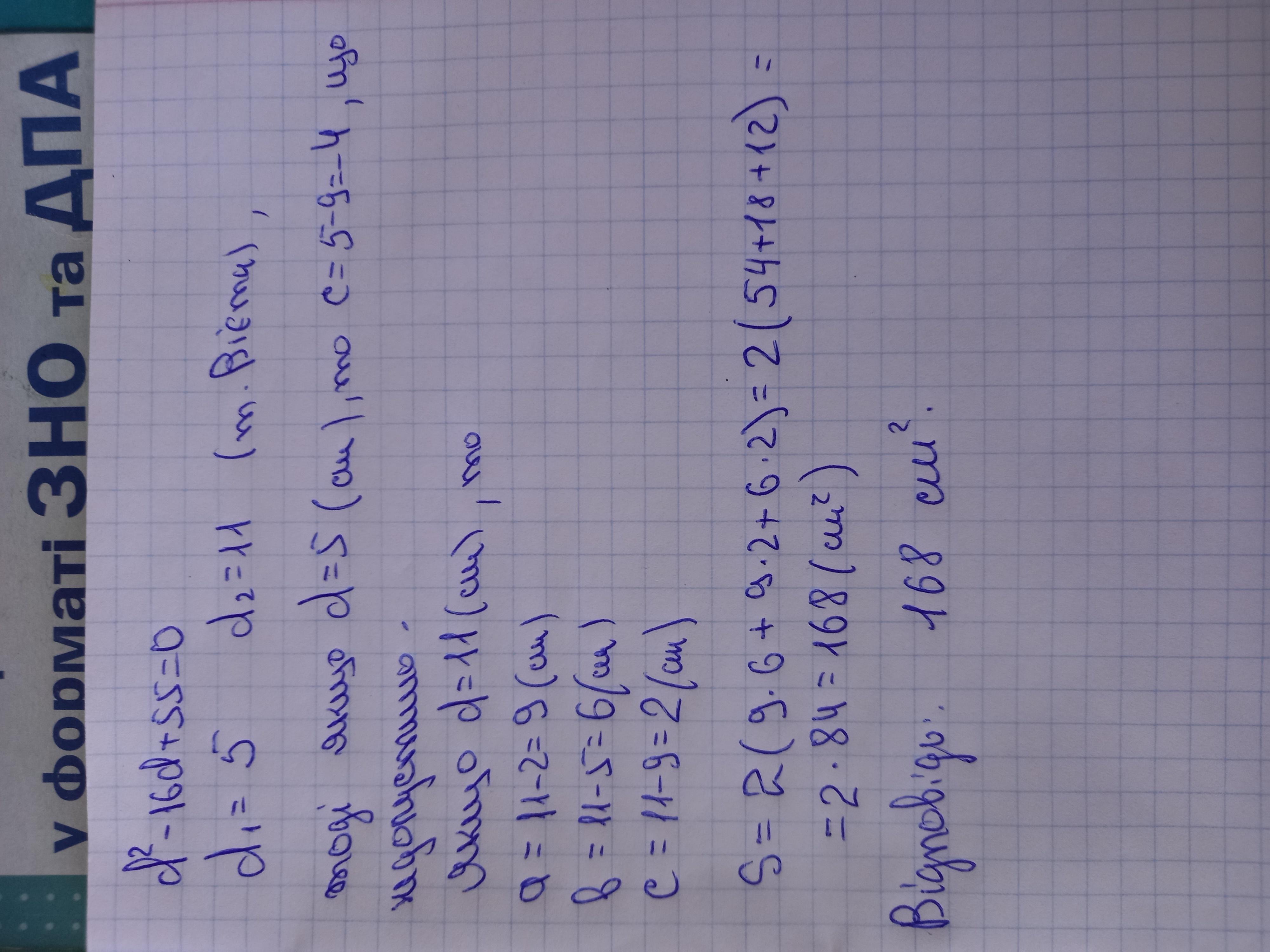 Знайти площу (у см2) повної поверхні прямокутного паралелепіпеда, якщо його діагональ більша за лінійні виміри відповідно на 2 см, 5 см і 9 см.