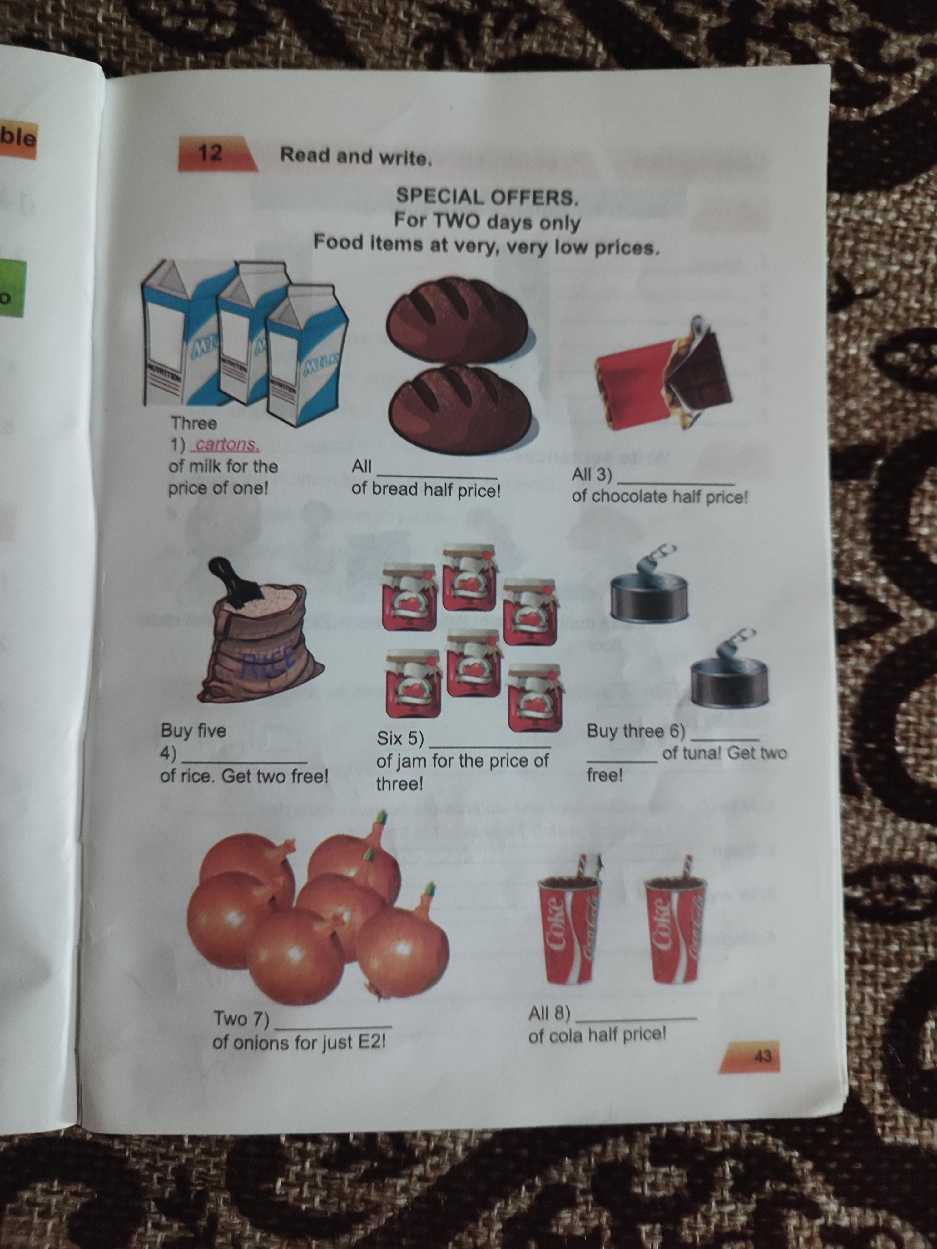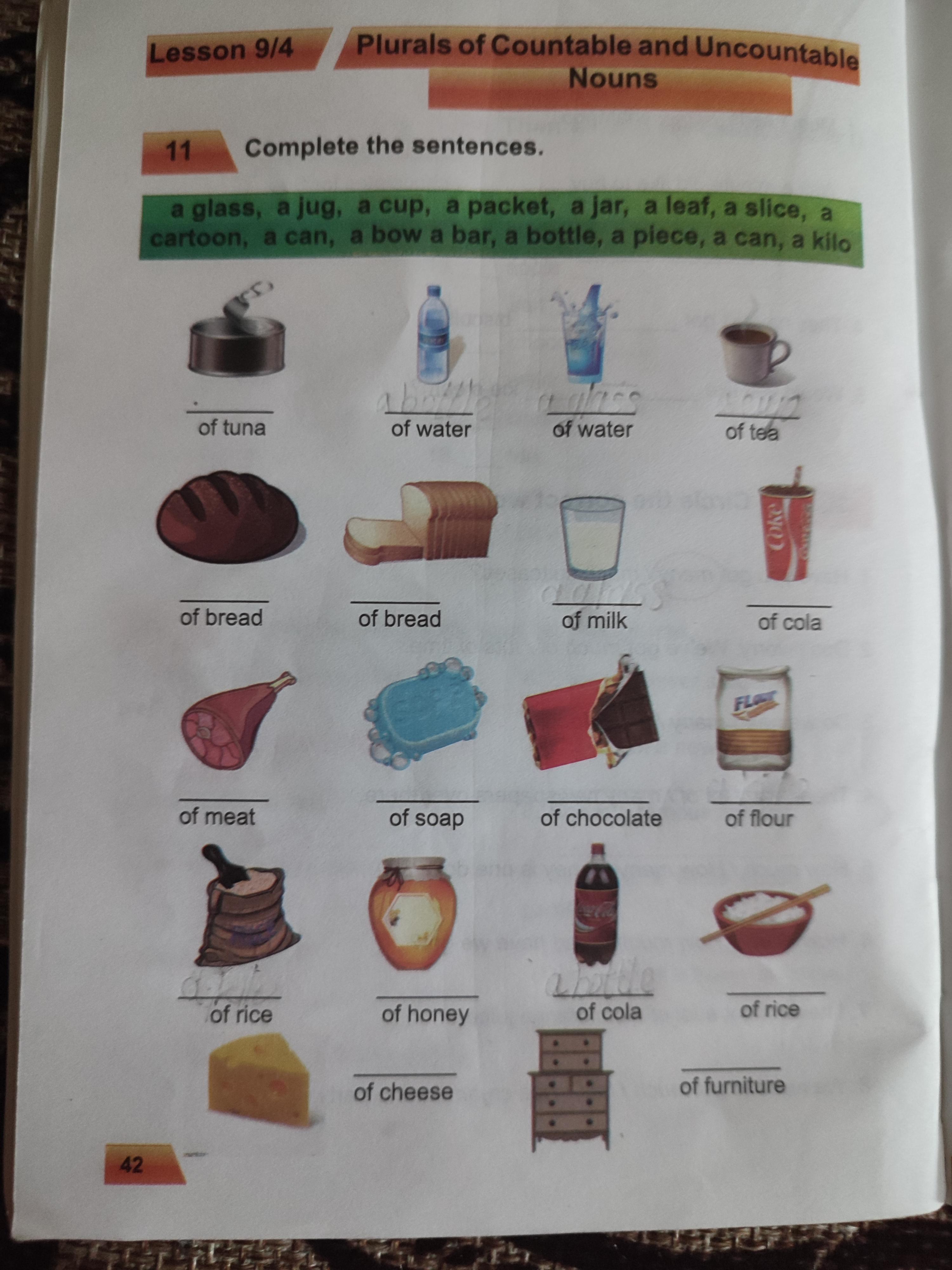 A jar of tuna, a bottle of water,a glass of water, a cup of tea, a piece of bread, a glass of milk , a glass of cola, a kilo of meat , a piece of soap , a bar of chocolate, a packet of flour, a packet of rice , a jug of honey, a bottle of cola, a leaf of rice, a piece of cheese, a kilo of furniture