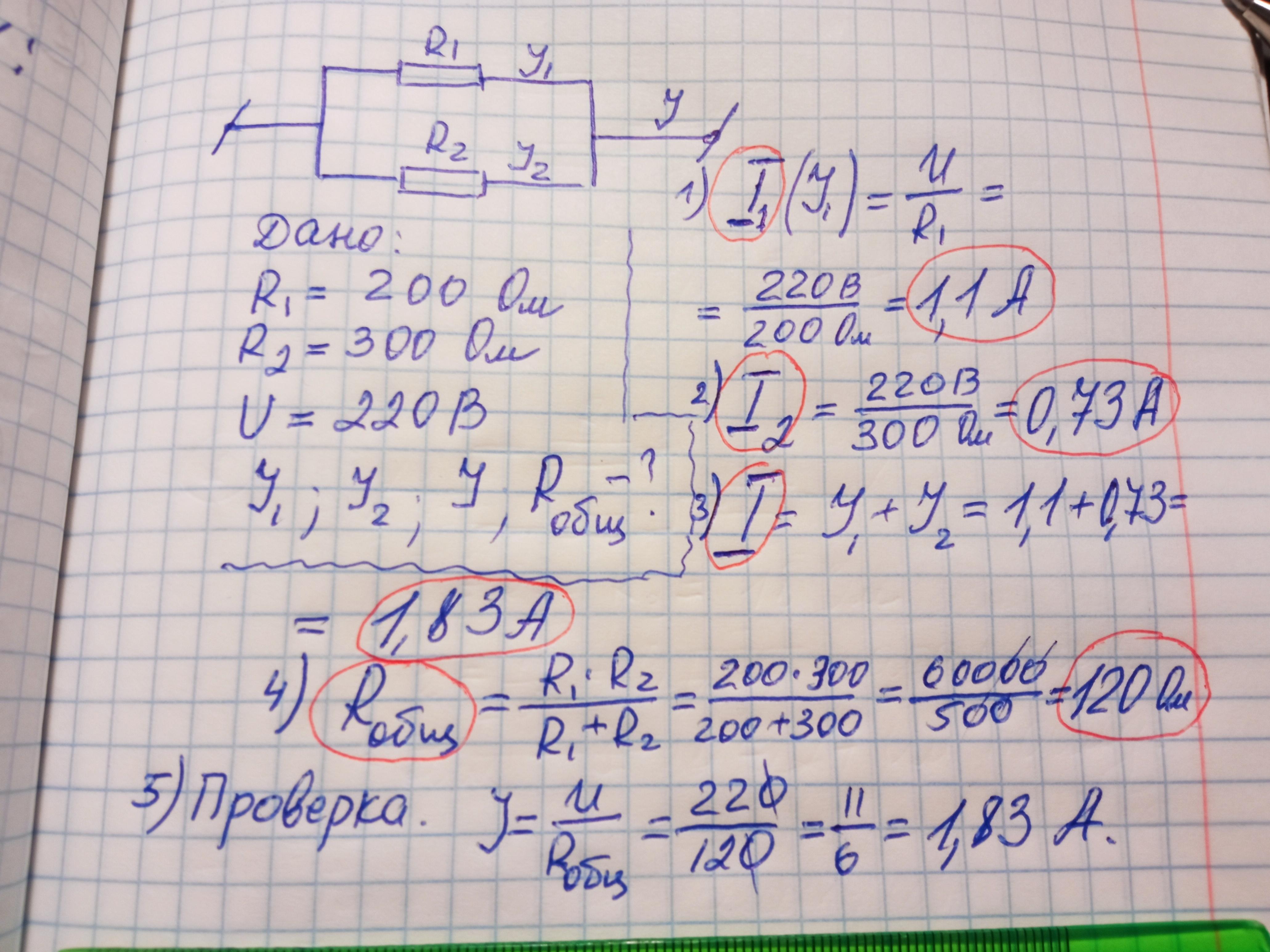 которых 200 и 300 Ом. Напряжение в сети 220 В. Определите силу тока в каждой лампе,