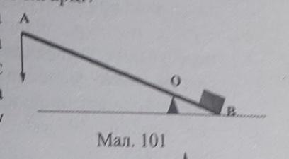 За допомогою важеля зображеного на малюнку 101 піднімають вантаж на висоту 0,5 м. Яку роботу виконує людина, діючи з силою 500 H на важіль в напрямку зображеному стрілкою, якщо AP:OB=3:1