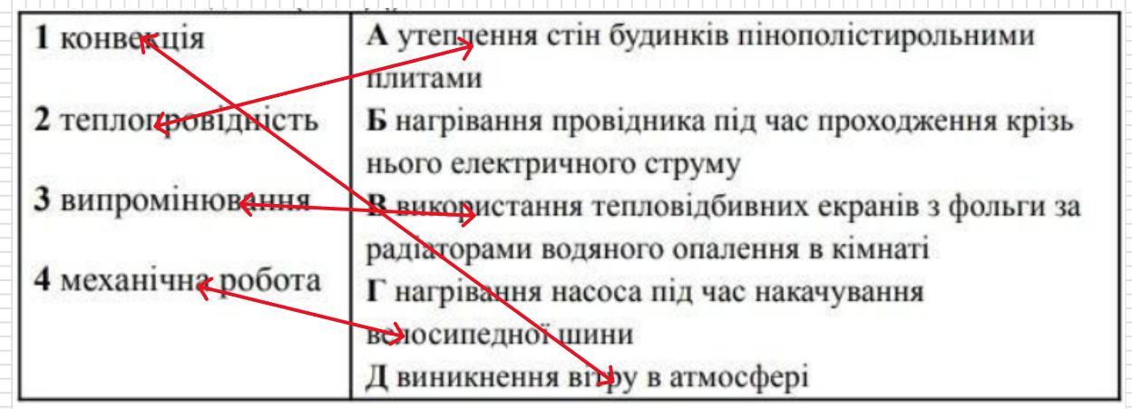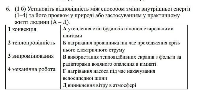 установіть відповідність між способами зміни внутрішньої енергії (1-4) та його проявом у природі або застосування у практичному житті людини (А-Д)
