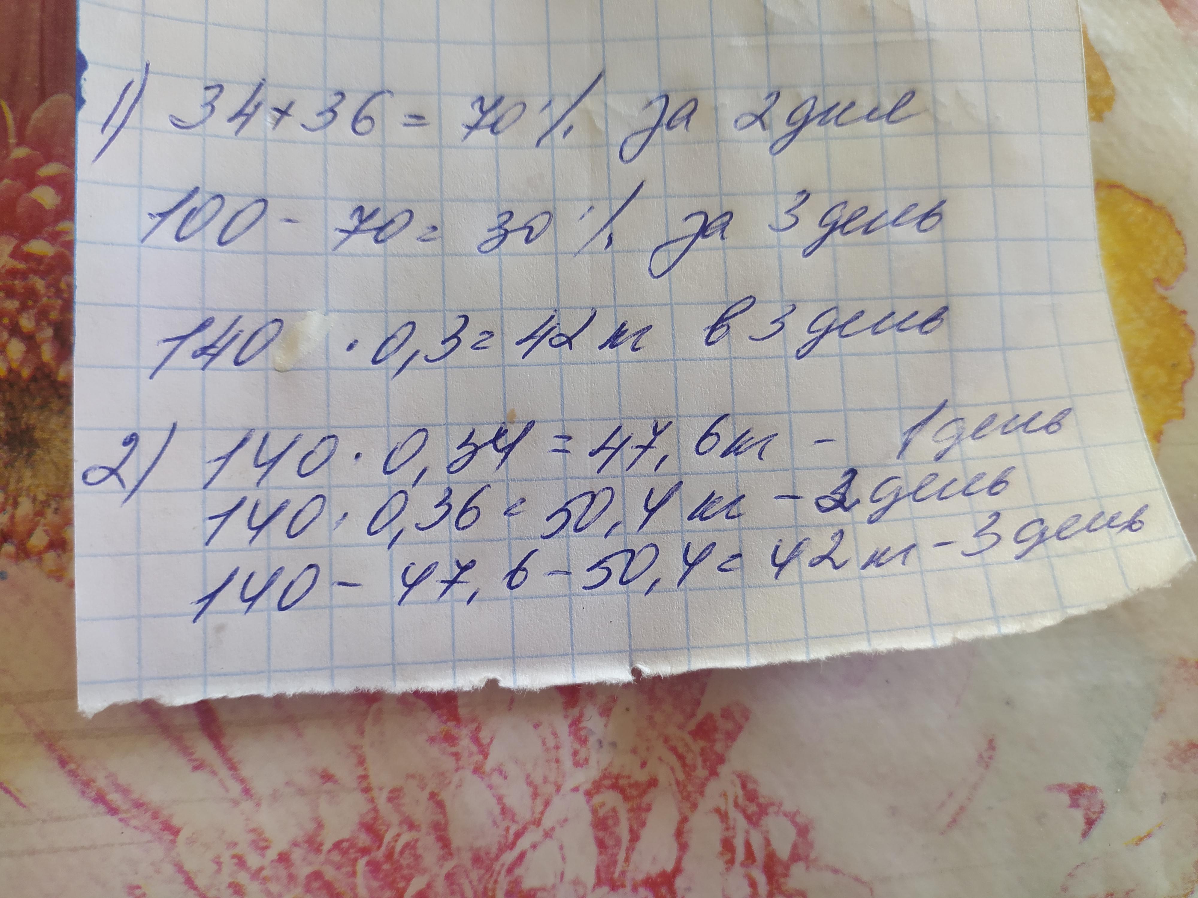За планом шкільна їдальня повинна була закупити 140 кг картоплі. Першого тижня вона закупила 36% картоплі, другого - 34%, а третього тижня - решту. Скільки картоплі закупила їдальня третього тижня