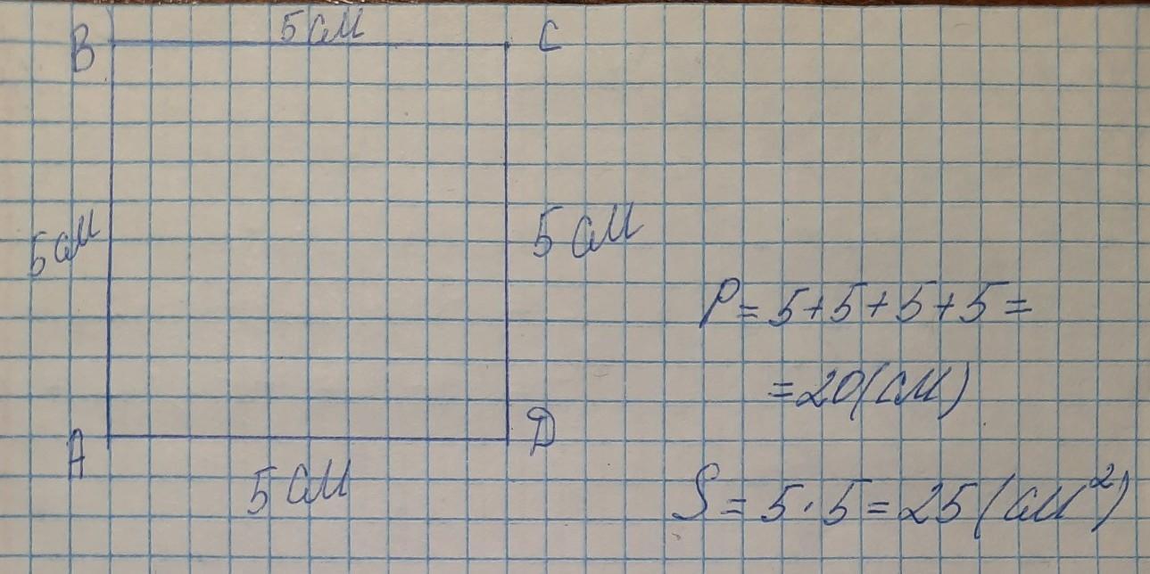 P= 5+5+5+5= 20см, S= 5×5=25см²