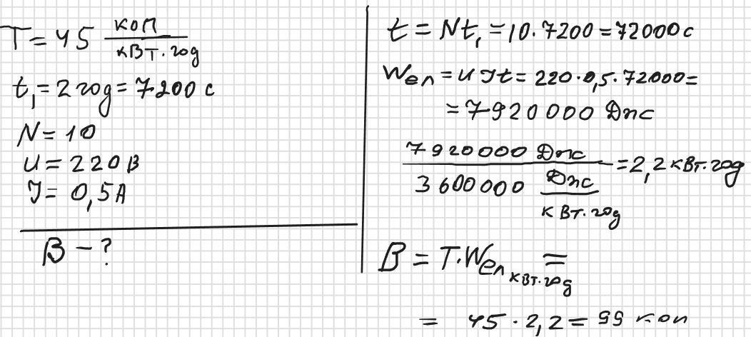 Срочно!!!!Підрахуйте вартість електроенергії при тарифі 45 коп/1 Квт год., що споживається електрокип'ятильником за 2 год. протягом 10 днiв при напрузі у колі 220 В і струмі 0,5 А.
